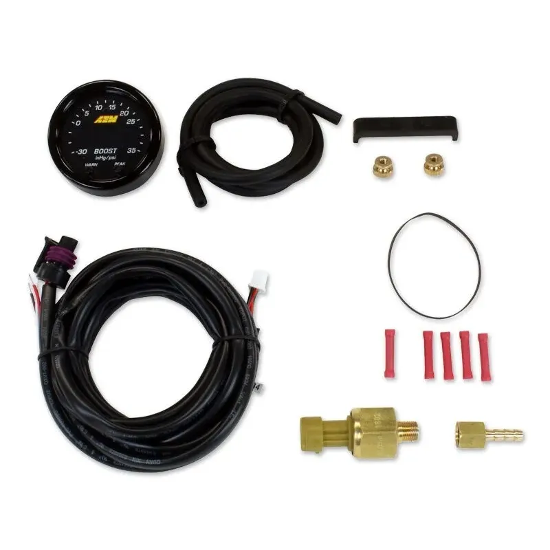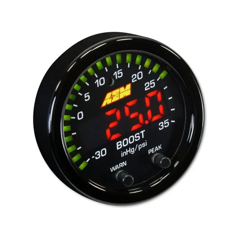 AEM's 30-0306 X-Series -30in/Hg~35PSI / -1~2.5BAR Digital Boost Display gauge combines incredible looks, increased readability and a multitude of new, easy-to-use features! It is a must for users who want highly accurate boost pressure readouts up to 35 PSI or 2.5 BAR in their high performance vehicle. NOTE: The 30-0306 comes with a black bezel and reversible black PSI/BAR boost pressure faceplate. You will need to purchase the optional 30-0306-ACC accessory kit to get the silver bezel and reversible white standard/metric boost pressure faceplate. Each faceplate is double sided with standard PSI on one side and metric BAR on the other. The calibration for standard or metric display is easily performed using the buttons on the face of the gauge. EASIER TO READ Visual improvements include a bright center LED display that is 87% larger than our original digital gauges and provides better readability. A sweeping green LED "needle" lines the edge of the gauge face for quick reference. A 33% overall increase in the gauge face display makes it easier to see at a glance. EASIER TO MOUNT Despite the larger display, X-Series Gauges are contained in a standard 2-1/16th-inch (52mm) diameter housing for mounting in a standard gauge pod. Thanks to an advanced single board design, X-Series Gauges have an incredibly slim overall depth of under 0.825", with a cup depth of only 0.200." This shallow cup depth allows X-Series Digital Gauges to be mounted practically anywhere. SMARTER INTERFACE X-Series Digital Gauges include new technological features that make them easier to use. Two buttons on the faceplate deliver programmability for peak/recall, standard or metric center LED readout and sweeping LED needle, and user-selectable threshold warnings. The gauges are AEMnet CAN-bus enabled, so they can be daisy chained together for use with the Infinity ECU, Series 2 EMS, AQ-1 Data Logger, or 3rd party EMS or logger that accepts AEMnet. 0-5V analog outputs are also included for inputting into data loggers and engine management systems.