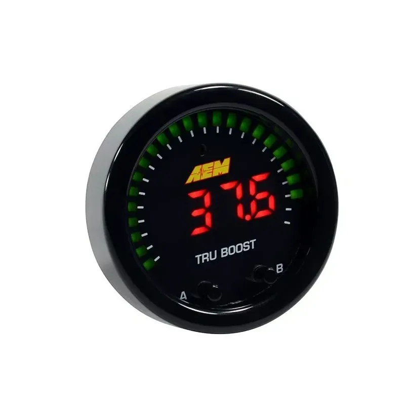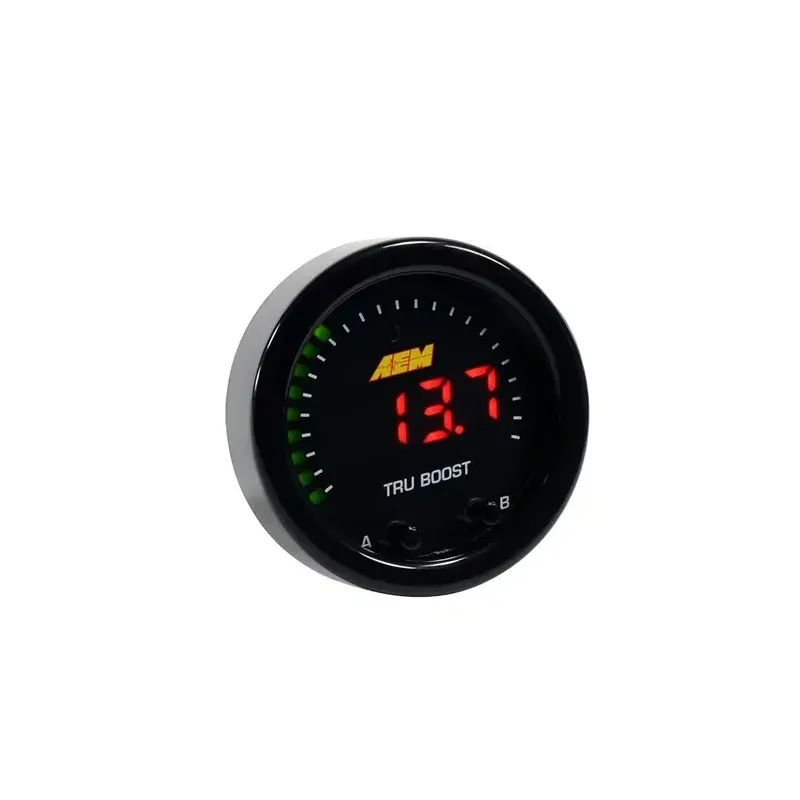 The Tru-BoostX Boost Controller Gauge delivers all of the features you loved about the original only now with AEMnet for data logging and a big, fat internal MAP sensor that can handle boost pressures up to 80 PSI of boost. The Tru-BoostX Boost Controller gauge delivers digital accuracy but with the simplicity of a manual boost controller. All AEM Tru-Boost gauge programming is done using the faceplate buttons and no laptop is required. AEM's specially designed Boost Control Solenoid and all necessary hardware is included. Program Two Boost Levels + Scramble Boost Setting - Program two boost modes for different levels of performance (up to 80PSIg internal MAP sensor), and program a time-based scramble boost setting that is controlled using a switched input. You can also turn off the controller and use the gauge as a display. Change Wastegate Open Pressure-Ideal for reducing boost spikes and improving spool up. Display Boost Levels in PSIg (PSI), BAR or kPa (PAS) -See your boost in the units you prefer, and scale the 24 outer LEDs to match your peak boost levels for the perfect sweeping motion. Set Alarms and Display Peak Boost-Set the 24 green outer LEDs to flash based on boost pressure so you are alerted to an overboost condition. A ground output is included for triggering an optional LED warning light. Select the "B" button to see peak boost level and clear the value using the menu. Overboost Protection Built In-Protects your engine from an overboost condition by shutting the boost control solenoid off until it is reactivated by you through the buttons on the faceplate. Integrated Error Protection-Alerts you to a fault if the boost control solenoid is shorted or disconnected so you are never left guessing whether the Tru-BoostX is operational. Datalog using AEMnet CAN bus-Outputting channels over AEMnet provides so much more than just boost pressure! Send 13 channels of data over a 2-wire connection, including boost pressure, peak boost, boost target, boost scramble duty, overboost status, wastegate crack pressure, boost control solenoid status and more.