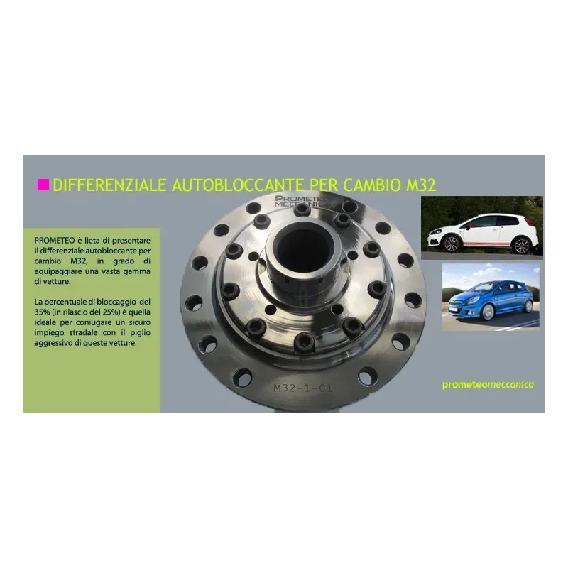 Prometeo self-locking differential with helical gears (also called "Limited Slip Differential"), right on 320 kgm (~3200 Nm) torque car, allows to share in an asymmetric way the driving torque coming from the engine. This means that the wheel with more grip will get an extra torque respect to the other (more unloaded) wheel. Locking rate of Prometeo differential in driving is about 35%. We prefered not to go over this rate because cars which self-locking can be fitted to still remain road cars.