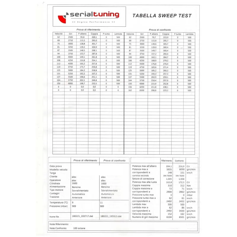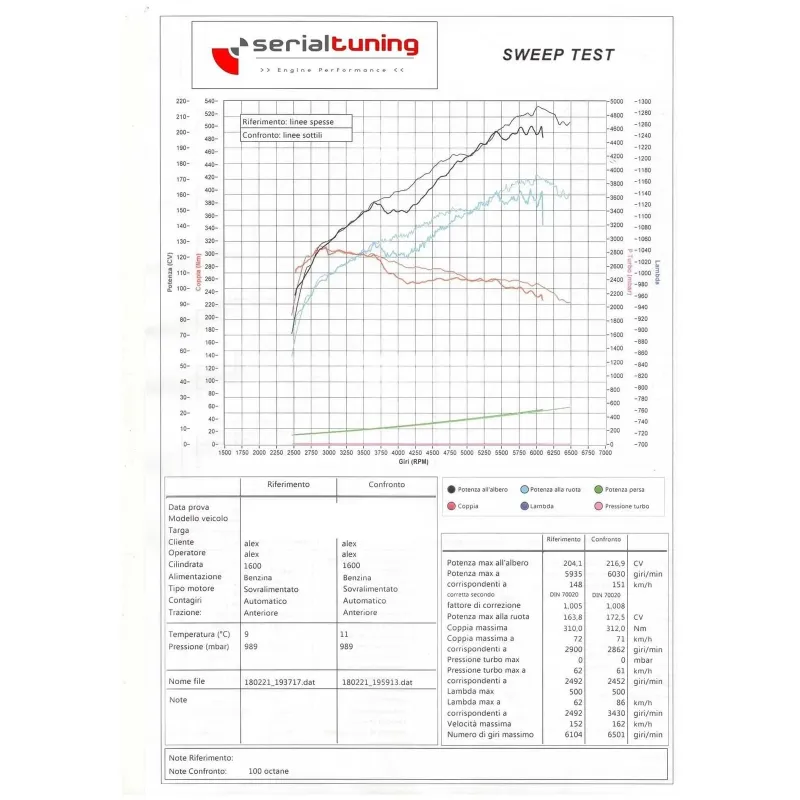 Additive test on Clio 1600 220hp trophy full stock . Full stock renault engine . The "tabular" comparison highlighted the quality of the additive used in the test in question (375ml protec additive on 40 litres of petrol). The total absence of ignition delay applied by the intervention of the knock sensor (-3, -6, -9) allowed the engine to have a good overall gain: +16hp over 6000 rpm and a very respectable maximum power. The corrections were reset and, thanks to the gain derived from the use of the protec additive (on average +3-5%), the engine successfully returned the power declared by the manufacturer. Recommended product.