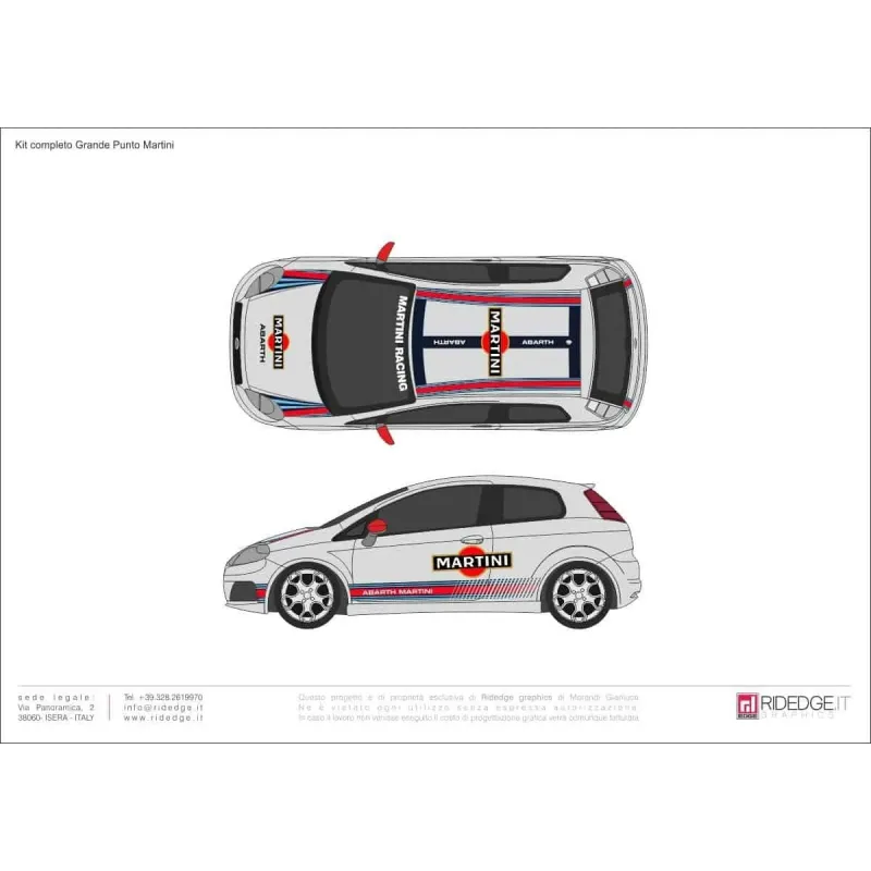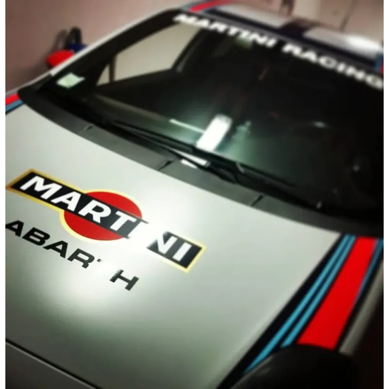 Complete EVO Abarth Martini Racing replica kit. Side panels for doors, bumpers, hood panels, roof and trunk. Martini digitally printed logos for doors, hood and roof are included.