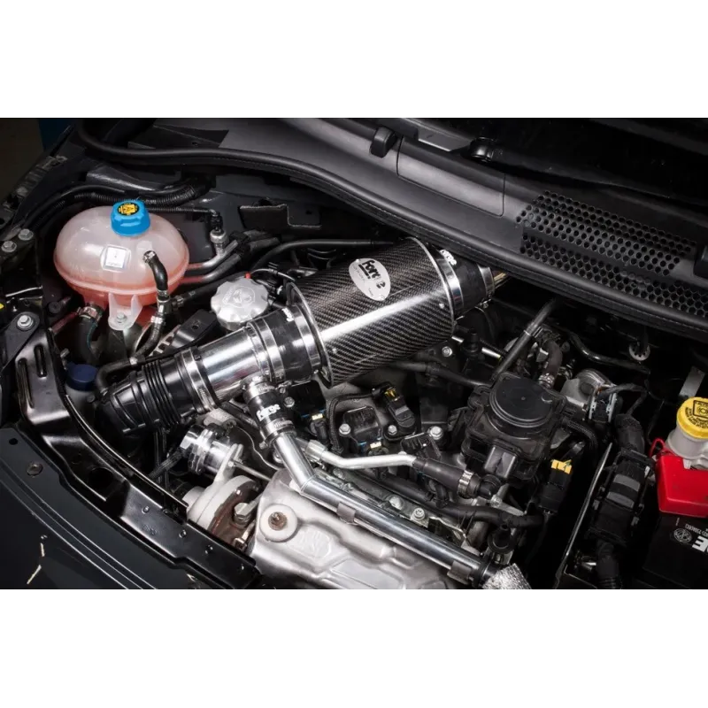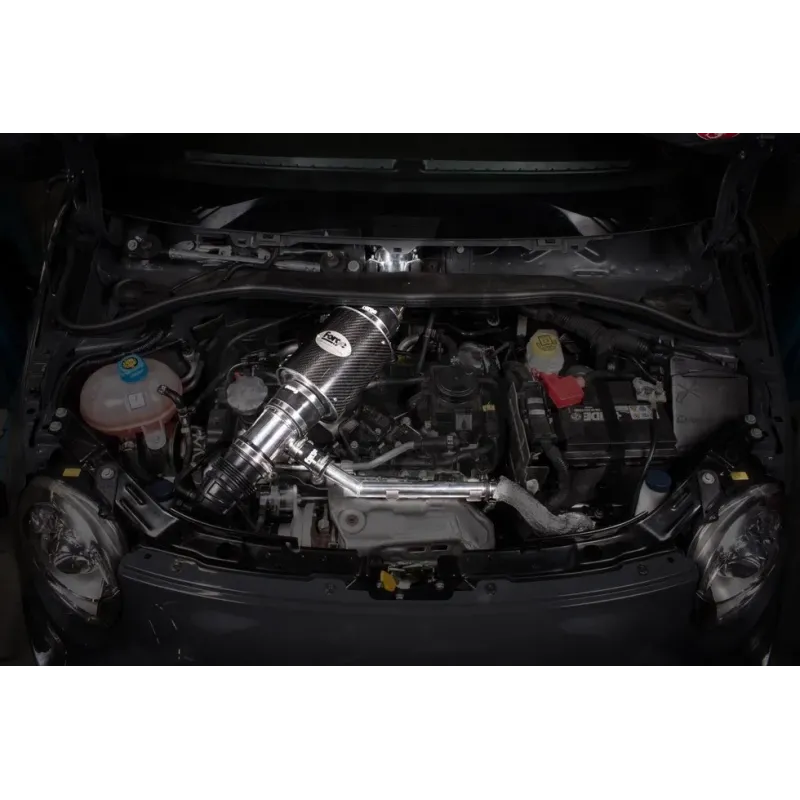 Kit aspirazione diretta per Abarth 500/595/695 Forge Motorsport, disponibile sia con filtro in spugna, sia con filtro in cotone (alloggiati in un cilindro in fibra di carbonio). Manicotti siliconici fornibili in colore nero, rosso o blu.