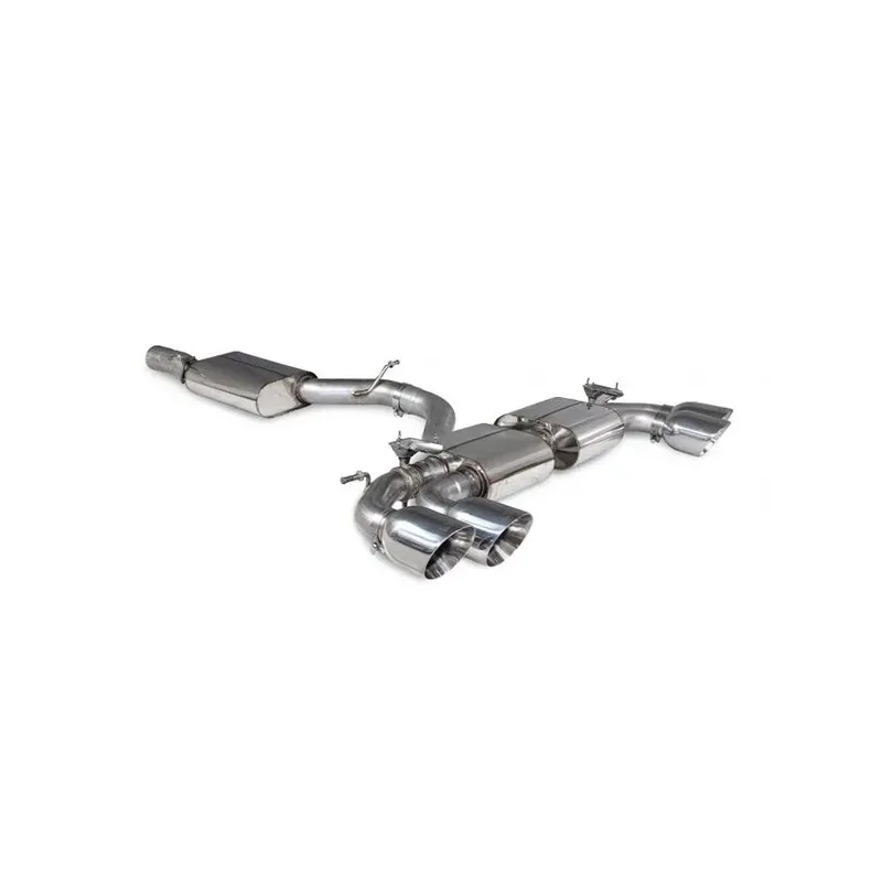 Cat-Back silenziato Scorpion specifico per Audi S3 8Y (Sportback). Linea da 80mm in acciaio T304 a scelta nel menù con o senza predisposizione valvole, con tre differenti finalini da 114mm a vostra scelta.