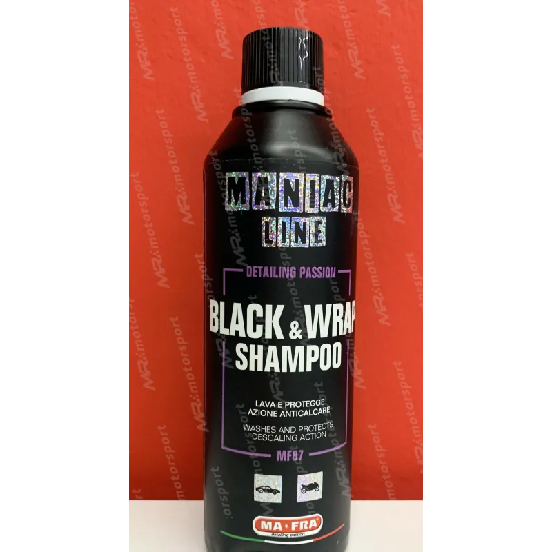 Black & Wrap Shampoo della Maniac Line™ di Mafra è il prodotto 2 in 1 ideato per auto nere, pellicolate o con PPF anche con rifinitura opaca.