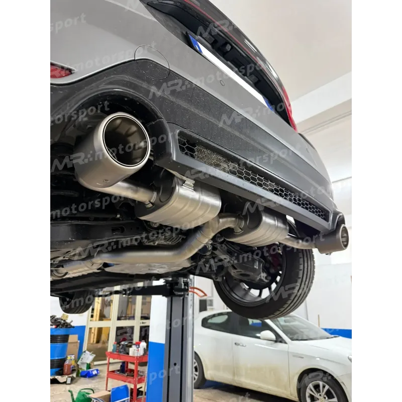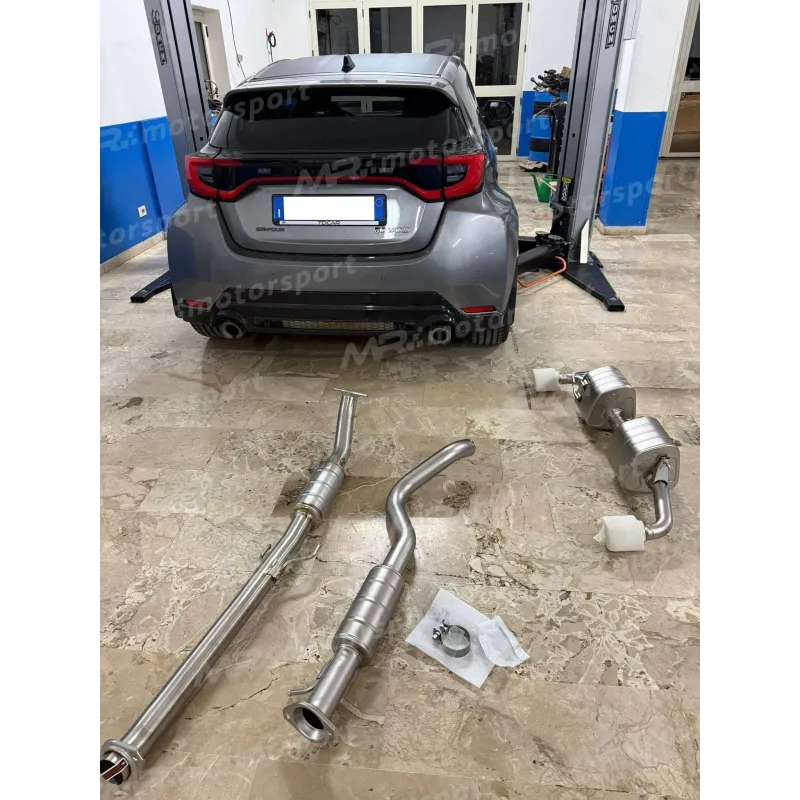 Questo scarico è prodotto utilizzando titanio di alta qualità, collaudato in gara, per l'intero sistema e presenta terminali di scarico a forma di megafono. Un collettore centrato tra i risonatori posteriori è stato fuso nella fonderia interna; questo collettore ottimizza e bilancia il flusso di gas per produrre un suono acusticamente sintonizzato senza ronzio. Tre risonatori, due nella parte posteriore del collettore e uno nel tubo centrale, sintonizzano ulteriormente l'esperienza sonora per creare un tono da corsa sportivo, esaltando completamente le caratteristiche del motore con un suono profondo ed entusiasta, per dare agli occupanti una sensazione di esaltazione che non viene mai interrotta da rumore eccessivo. Gli ingegneri hanno posto un'enfasi speciale sull'acustica nella gamma di regimi medi e alti, con un tono ad alta frequenza a regimi più elevati e più suono al minimo e in accelerazione. Questo suono è gestito da due terminali di scarico in titanio a forma di megafono che sono saldati allo scarico e rivestiti appositamente per resistere a qualsiasi cambiamento di colore ad alte temperature. La forma dei terminali di scarico influenza il suono. Sviluppato per ridurre la contropressione, il sistema pesa 6,8 kg, ovvero il 48,3% in meno rispetto allo standard, e produce guadagni di potenza di 3,5 kW (4,8 CV) a 6.950 giri/min e aumenti di coppia di 4,9 Nm a 6.950 giri/min quando testato sul dinamometro Akrapovi? rispetto a una Toyota GR Yaris con uno scarico standard di serie. Questo scarico è progettato per l'uso solo su piste da corsa e circuiti chiusi. Il prodotto è imbullonato e non è necessaria alcuna rimappatura della centralina per questa configurazione.