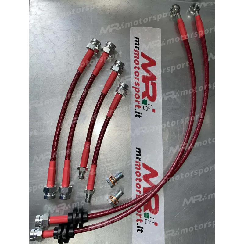 Kit composto da 6 tubi freno ANTERIORI + POSTERIORI con interno in nylon, esterno in treccia inox rivestita.