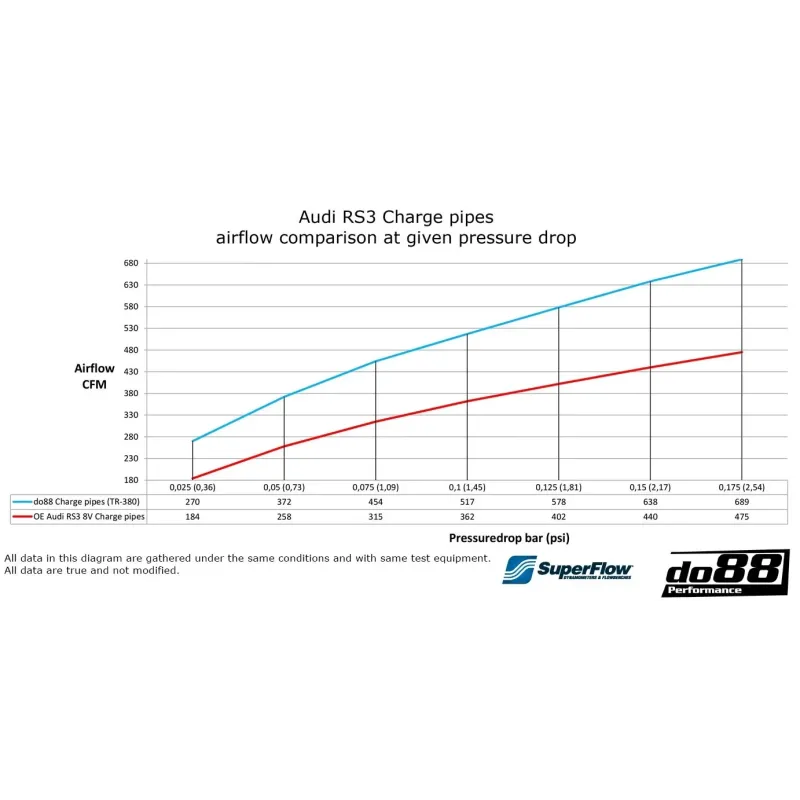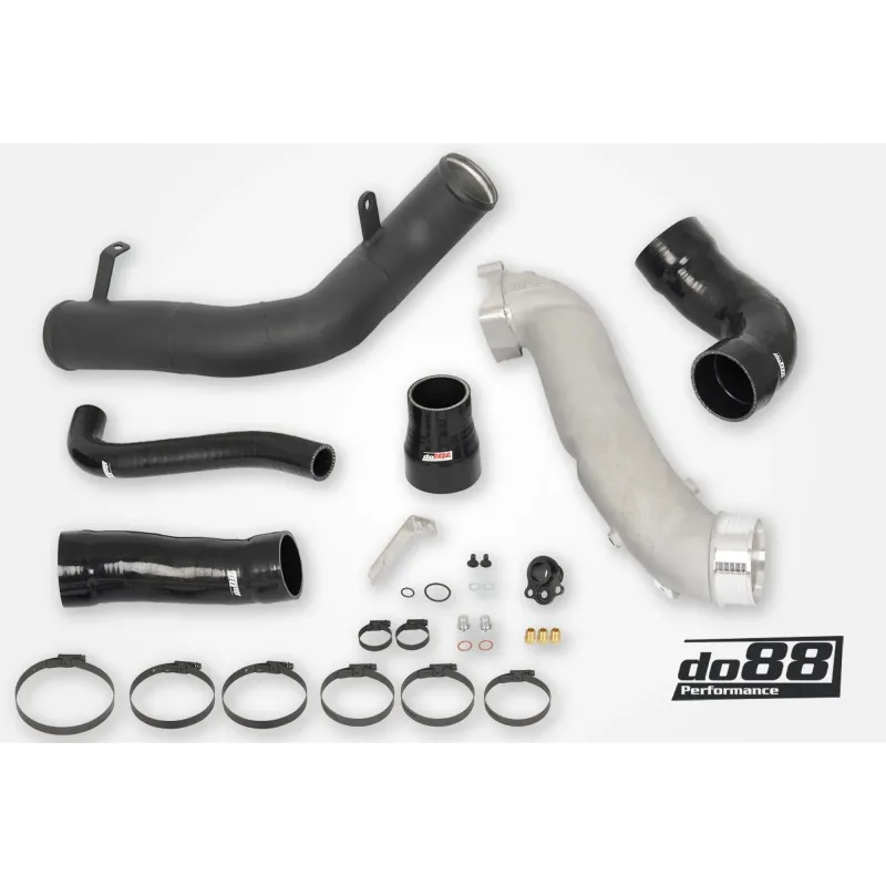 Questo kit include tutti i tubi e i flessibili da e per l'intercooler. Il kit è progettato per integrare e migliorare ulteriormente le prestazioni dell'intercooler ad alte prestazioni do88, dotato di un nucleo Garrett con potenza nominale fino a 1000 CV. I tubi di carica OEM non sono ottimali dal punto di vista del flusso d'aria, con diverse curve strette e ridotte che riducono il flusso. Il kit tubi do88 è significativamente più grande con transizioni fluide, offrendo un aumento del 31% del flusso d'aria!