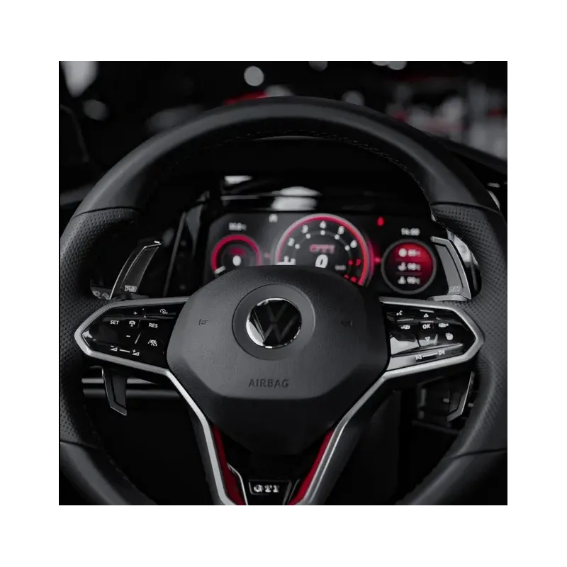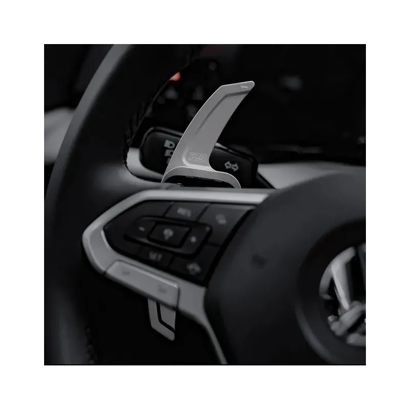 Set Leyo PD Paddle estensioni palette originali DSG specifiche per volanti VW Golf mk8 GTI/R e derivate realizzate tramite CNC con alluminio billet 6061, totalmente ergonomiche e Plug & Play, senza utilizzo di adesivi che potrebbero rovinare il paddle originale, applicate direttamente sopra e strette tramite brugola.
